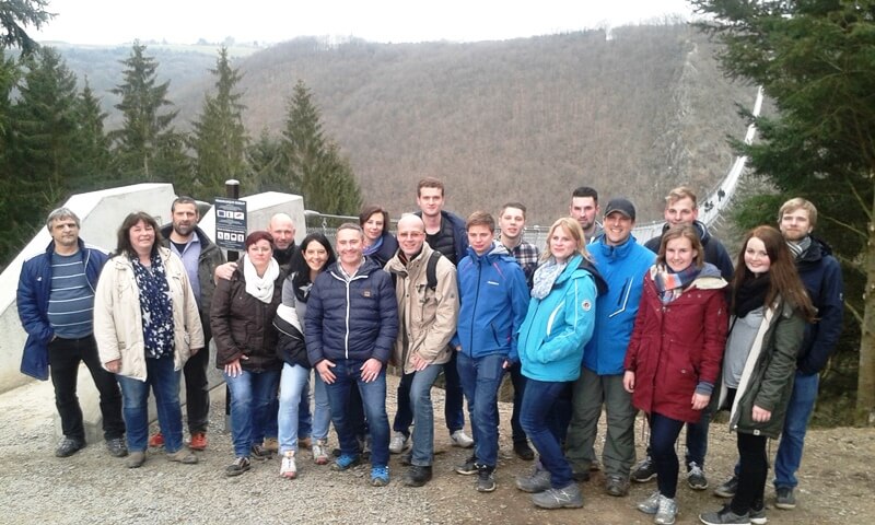 Eine Woche vor Ostern konnten sich die Jugendbetreuer des SV Niederwerth auf ein lange erarbeitetes spielfreies Wochenende freuen. Alle Spiele waren verlegt, alle Kids bei den Babysittern untergebracht, und so ging es fast vollzählig zur Geierlay-Hängeseilbrücke in den Hunsrück. Ja, wir waren im Hunsrück, und nicht im Taunus, wie ein Erdkunde-Leistungskurs-Betreuer irritiert feststellen musste. Die SVN-Taxis (vielen Dank an die vereinseigenen Chauffeure) brachten die Ausflügler von der Insel zur Ruine Balduinseck, wo auf die Jugendbetreuer eine exklusive Wanderroute wartete, die weder in Wanderkarten noch bei google.maps zu finden war. Über reißende Bäche, Brücken und auch seilgesicherte Trampelpfade schlängelte sich der Wanderweg zur Hängeseilbrücke. Die 360 Meter lange und 100 Meter hohe Brücke war ausnahmsweise nicht mit Touristen überlaufen, so dass man den Ausblick in luftiger Höhe richtig genießen konnte. Hinter der Hängeseilbrücke wartete dann ein extra aufgestellter Imbisswagen auf die durstigen Wanderer. Auch wenn einige Wanderer bis zuletzt an eine Fata Morgana glaubten, so wurde die Verpflegungsstadion auf freiem Feld doch tatsächlich nur für die Sechsunddreißiger geöffnet. Nun war der größte Teil der Strecke geschafft. Von wieder aufkommendem Hunger – oder teilweise auch vom Durst – angetrieben, erreichten wir nach weiteren vier Kilometern sogar früher als geplant den Landgasthof Zur Post in Zilshausen. Die zuvor engagierten Testesser hatten offenbar die richtige Einkehrmöglichkeit ausgesucht, so dass bei gutem Essen und gepflegten Getränken der Tag genüsslich ausklingen konnte. Um 22 Uhr brachte ein Kleinbus in Mannschaftstärke die müden Wanderer dann zurück auf die Insel.