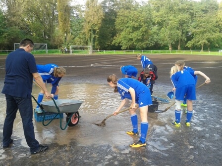 Mit Wasser kennt man sich auf der Insel aus. SVN-Mädels beim Aufwärmprogramm und Trockenlegen eines Wassertümpels vor Spielbeginn.