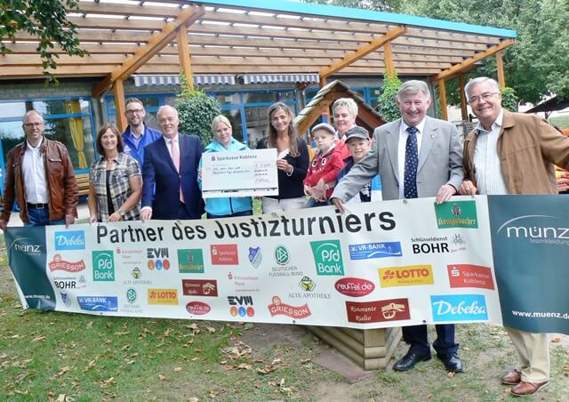 Diesen warmen Regen dürfen sich nun die Niederwerther Fördervereine der Grundschule, des Kindergartens und des SVN-Jugendfußballs teilen und den Jüngsten der Insel zu Gute kommen lassen. Beigeordneter Klöckner dankte für das Orga-Team Justizrat Matthias Karst für sein Management und die sportlich faire Ausrichtung, Herrn Dierkes, dem langjährigen Mentor des Turniers, dem SV Niederwerth in Person des 1. Vorsitzenden Jürgen Bähner und Geschäftsführer Matthias Klöckner, den Leiterinnen der Niederwerther Bildungseinrichtungen, Nikola Vater-Uhlich (Grundschule) und Ute Steinebach (Kiga) sowie den Vorsitzenden der Fördervereine, Heike Klöckner und Tanja Klöckner, für ihren Beitrag am traditionellen Turnier. Ortsbürgermeister Sepp Gans stellte das große Engagement heraus, das mit diesem Sportevent der Justiz verbunden ist. In all den Jahren des Justizturniers sei nun eine dicke 5-stellige Summe zusammengekommen, die zum Wohle der Niederwerther Kinder eingesetzt werden konnte. Spielgeräte, Bastelmaterial, Bücher, Lernhilfen, Mobiliar, PC´s aber auch Bälle, Tore, Turnmatten und Trikots und auch Ausflüge und Exkursionen für die Kinder und Jugendlichen der Insel konnten mit dem Geld finanziert werden. Herzlichen Dank! Im Jahr 2016 richtet der neue Gewinner das Turnier traditionsgemäß aus, das Landgericht Koblenz mit seiner Präsidentin Marliese Dicke.