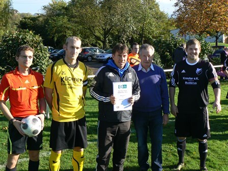 Foto: Die Ehrung vor dem Match: (v.l.) SR Daniel Richter, Christian Kleid (Kapitän SG Unzenberg), Fair-geht-vor-Sieger Robby Brace, Winfried Höfer (FV Rheinland) und Micki Parschau (Kapitän des SV Niederwerth).